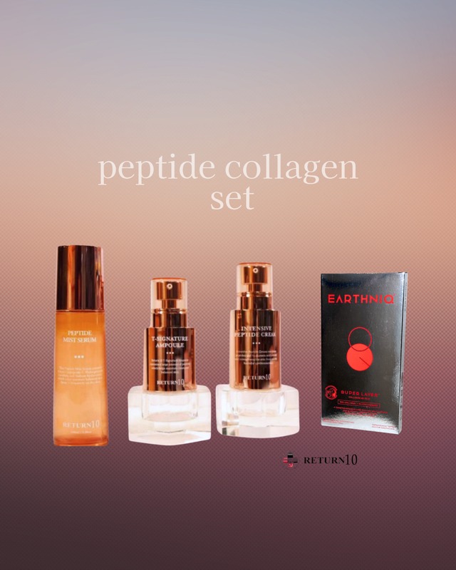 【 Peptide Collagen Set】 — 肌を“上向き記憶”させる、再生リフトのフルラインケア — ペプチドとコラーゲンの融合で、ハリ・弾力・ツヤを再構築。 角層から深部まで“再生の連鎖”を起こす、次世代のエイジングケアセットです。 ⸻ ※セット内容 ① RETURN10 Peptide Mist Serum(ペプチドミストセラム) 微細ミストが瞬時に肌へ浸透。洗顔後すぐに使うことで、後のスキンケア効果を最大化。 乾燥・くすみをリセットし、しっとりツヤめく素肌へ。 ・うるおい・鎮静・ハリUP ・メイクの上からも使用可 ② RETURN10 T-Signature Ampoule(Tシグネチャーアンプル) 高濃度ペプチド×ヒアルロン酸が肌密度を高め、ハリを引き上げる集中美容液。 内側から“パンッと”押し返す弾力肌へ導きます。 ・たるみ・小ジワケア ・即効ハリ実感 ③ RETURN10 Intensive Peptide Cream(インテンシブペプチドクリーム) 肌を包み込むようなリッチなテクスチャ。寝ている間にダメージを修復し、朝は“ふっくら透明肌”に。 ・ナイトリペア・弾力強化 ・エイジングサイン集中ケア ④ EARTHNIQ Super Layer Collagen Lift Film(スーパーコラーゲンリフトフィルム) 貼ってスプレーするだけで、サロン級のリフトアップを実現。 ナノファイバー構造の99%ピュアコラーゲンが、肌の上で溶けながら深部まで浸透。 ・目元・頬・首のハリ集中ケア ・リフトアップ+31.3%、保湿+52.7% ⸻ ※トータルケアステップ 1.ミストセラム:水分ブースト 2.アンプル:ハリをチャージ 3.クリーム:潤いを固定 4.コラーゲンフィルム+ミスト:上向きを記憶 ⸻ ・ハリ・弾力・透明感のトリプル改善 ・肌密度を高める再生ペプチドケア ・ナノコラーゲンによる即効リフトアップ ・韓国皮膚科・高級ホテル採用ブランドライン 【フィルム使用方法】 1️⃣ ミストで肌をしっとり湿らせる。 2️⃣ コラーゲンフィルムを気になる部分(目元・頬・額・首)に密着。 3️⃣ もう一度ミストをスプレーし、完全に溶かす。 4️⃣ 成分が吸収されたらクリームで仕上げ。 【推奨】使用タイミング •朝:ミスト → アンプル → クリーム •夜:ミスト → アンプル → クリーム → コラーゲンフィルム(週2〜3回) ⸻ ※ワンポイントアドバイス ・メイク前にミストを使うと密着力UP。 ・ナイトケアでフィルムを使用すると、翌朝のフェイスラインがすっきり。 ・乾燥の季節は、日中もミストをバッグインしておくのがおすすめ。 -ご注意- お肌に傷、腫れ物、湿疹等の異常がある時は使用しないで下さい。/使用中、使用後に赤味、腫れ、痒み、刺激、色抜け、黒ずみ等の異常が現れた際は速やかに使用を中止して皮膚科専門家に相談される事をおすすめします。/目に入らないようご注意下さい/乳幼児の手の届かないところへ保管して下さい/高温や多湿や直射日光を避けて保管してください。 使用中、使用後などの開封後、お肌に合わない等の不良品以外での返品、返金、交換は致しませんのでご了承ください。