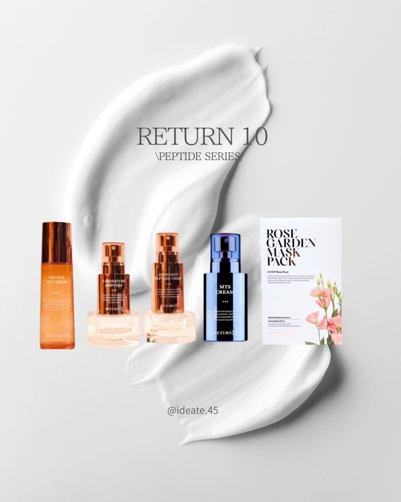 RETURN10 パーフェクトセット — 肌を“上向き記憶”させる、再生リフトと美白へのアプローチが可能なフルラインケア — ペプチドとコラーゲンの融合で、ハリ・弾力・ツヤを再構築。 微細な針(スピキュール)でターンオーバーを促しトーンアップに効果的なホワイトニングクリーム。 角層から深部まで“再生の連鎖”を起こす、次世代のエイジングケアセットです。 ⸻ ※セット内容 ① RETURN10 Peptide Mist Serum(ペプチドミストセラム) 微細ミストが瞬時に肌へ浸透。洗顔後すぐに使うことで、後のスキンケア効果を最大化。 乾燥・くすみをリセットし、しっとりツヤめく素肌へ。 ・うるおい・鎮静・ハリUP ・メイクの上からも使用可 ② RETURN10 T-Signature Ampoule(Tシグネチャーアンプル) 高濃度ペプチド×ヒアルロン酸が肌密度を高め、ハリを引き上げる集中美容液。 内側から“パンッと”押し返す弾力肌へ導きます。 ・たるみ・小ジワケア ・即効ハリ実感 ③ RETURN10 Intensive Peptide Cream(インテンシブペプチドクリーム) 肌を包み込むようなリッチなテクスチャ。寝ている間にダメージを修復し、朝は“ふっくら透明肌”に。 ・ナイトリペア・弾力強化 ・エイジングサイン集中ケア ④ MTS Cream 微細な針でお肌のターンオーバーを促しトーンアップへの有効成分を深部まで浸透させます。 エイジングケアだけでなくシミやくすみの悩みへアプローチ。 ⑤ローズガーデンマスク 10枚入り 2ステップで贅沢なシートマスク。 保湿力とエイジングケアとリフティング効果に優れた処方が特徴。 ⸻ ※トータルケアステップ 1.ミストセラム:水分ブースト 2.アンプル:ハリをチャージ 3.MTSクリーム:微細な針でトーンアップ 4.ペプチドクリーム:高保湿クリームで潤いに蓋 ※ローズマスクをご使用の際は1と2の間にご使用ください ⸻ ・ハリ・弾力・透明感のトリプル改善 ・肌密度を高める再生ペプチドケア ・ナノコラーゲンによる即効リフトアップ ・韓国皮膚科・高級ホテル採用ブランドライン 【推奨】使用タイミング •朝:ミスト → アンプル → →MTSクリーム→ペプチドクリーム •夜:ミスト → ローズマスク(可能であれば毎日推奨)アンプル → MTSクリーム → →ペプチドクリーム ⸻ ※ワンポイントアドバイス ・メイク前にミストを使うと密着力UP。 ・ナイトケアでローズマスクを使用すると、翌朝のフェイスラインがすっきり。 ・乾燥の季節は、日中もミストをバッグインしておくのがおすすめ。 -ご注意- お肌に傷、腫れ物、湿疹等の異常がある時は使用しないで下さい。/使用中、使用後に赤味、腫れ、痒み、刺激、色抜け、黒ずみ等の異常が現れた際は速やかに使用を中止して皮膚科専門家に相談される事をおすすめします。/目に入らないようご注意下さい/乳幼児の手の届かないところへ保管して下さい/高温や多湿や直射日光を避けて保管してください。 使用中、使用後などの開封後、お肌に合わない等の不良品以外での返品、返金、交換は致しませんのでご了承ください。
