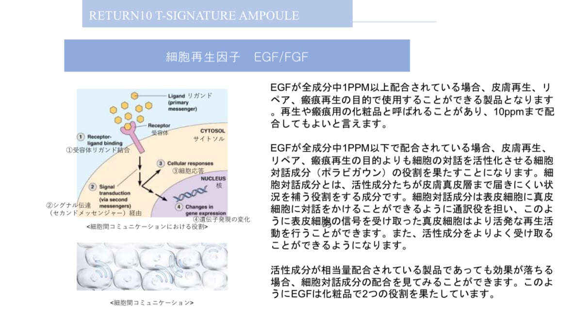 肌細胞そのものの活性化を促す「EGF(上皮成長因子)」を中心に、ヒアルロン酸ナトリウム、ペプチド、カタツムリ粘液ろ過物などの再生・保湿・修復成分を高濃度で配合したプレミアムアンプルです。