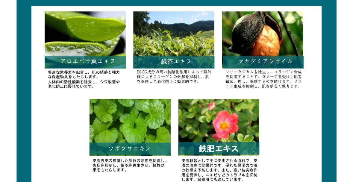 •鉄肥(ナツツバキ)エキス:高保湿・抗炎症で肌荒れを防ぐ。