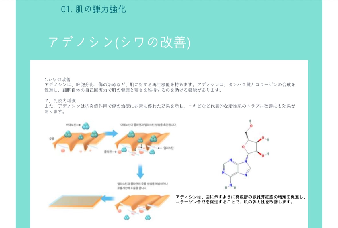 トリペプチド-1銅、アセチルヘキサペプチド-8、パルミトイルテトラペプチド-7、アデノシンがコラーゲン合成を促進し、肌にハリと弾力を与えます。